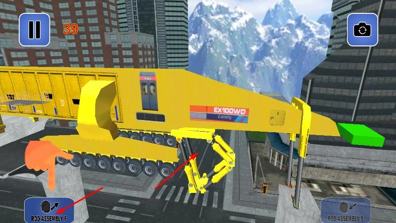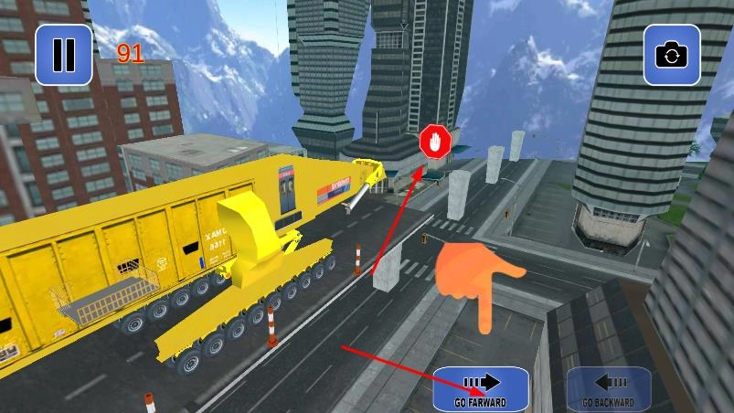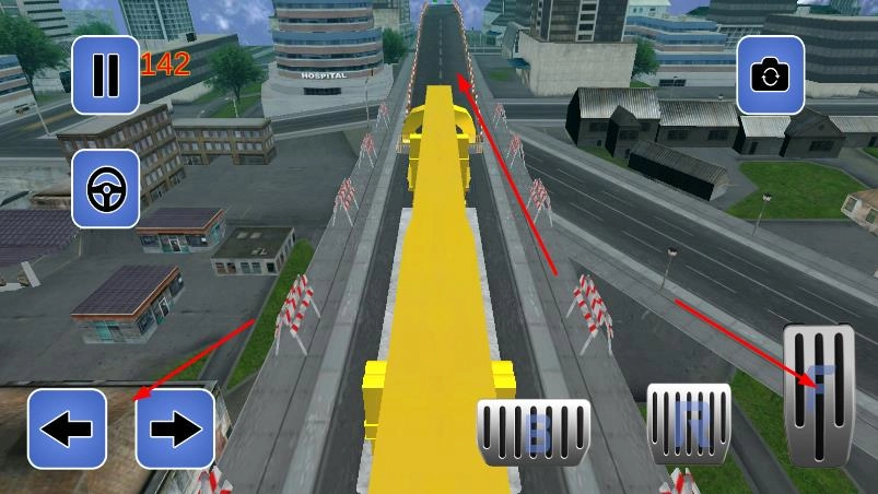 进入游戏后,你需要操控黄色的工程车。通过屏幕下方的方向按钮——包括左右箭头以及油门和刹车键——来控制车辆移动,让它在道路场景中行驶,最终前往桥梁的建设地点。