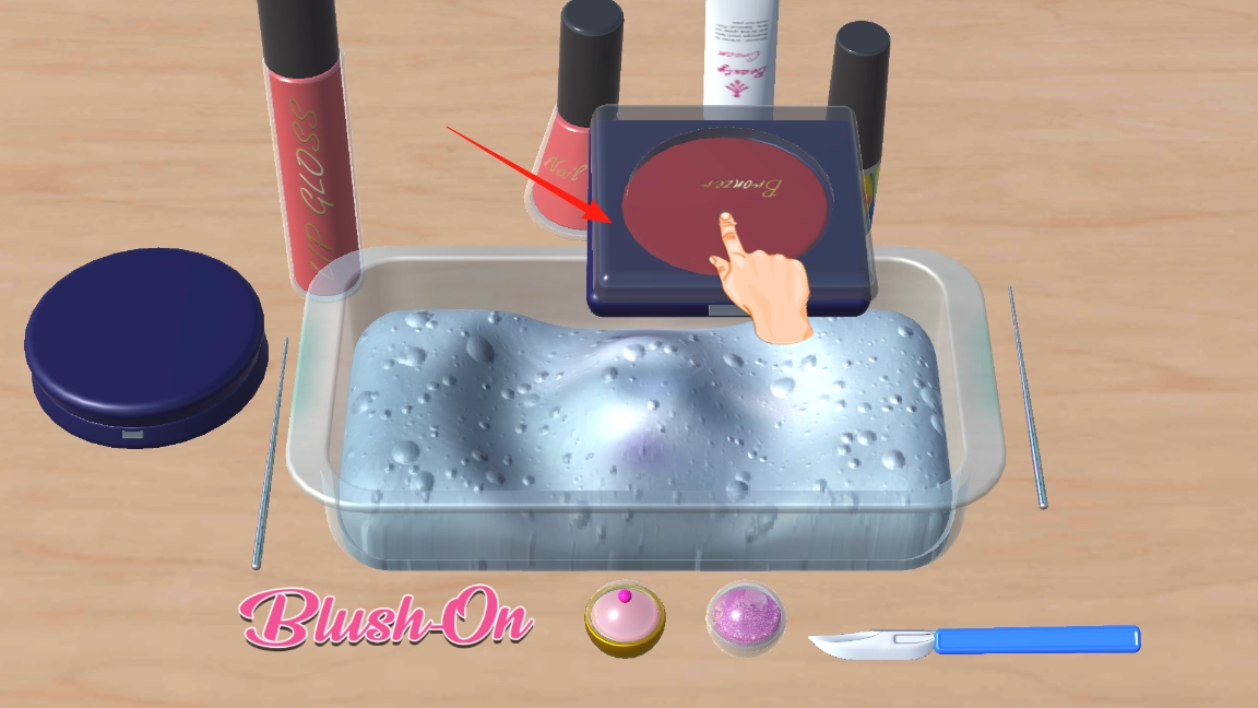 现在进入美妆史莱姆的制作环节,界面上陈列着腮红等材料。点击腮红盒,取出腮红并添加到史莱姆里,通过点击操作精准投放各类材料,一步步推进史莱姆的制作进程,体验细节调配的独特机制。