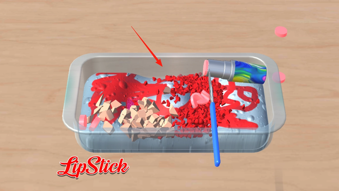 进入口红添加环节,界面上呈现出口红碎块与工具,通过拖动工具的操作,将口红碎块混入史莱姆中,再借助持续的拖动动作,使材料充分融合,从而完成口红添加步骤,感受材料混合这一独特的过程。