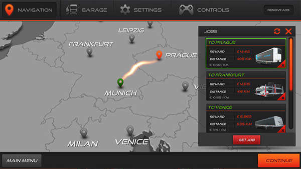 3、驾驶车辆前往地图上的绿色标记区域接取任务,根据货物类型和路线选择合适的工作,点击“GET JOB”确认领取。