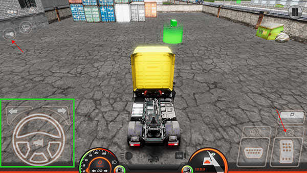 2、点击左上角菜单中的钥匙图标启动车辆,右下角控制油门前进,绿色区域为方向盘操作区。