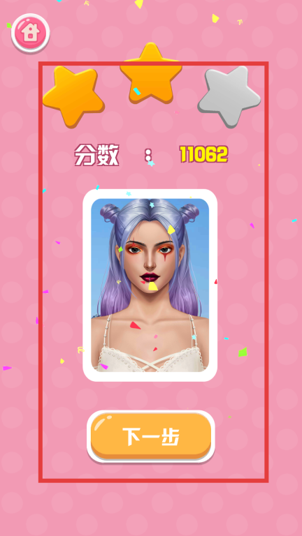 3、拍照完成后游戏跳转至结算界面,界面展示获得星级、分数及角色造型预览,点击下一步按钮,可继续进行下一轮美妆挑战或进入其他游戏环节。