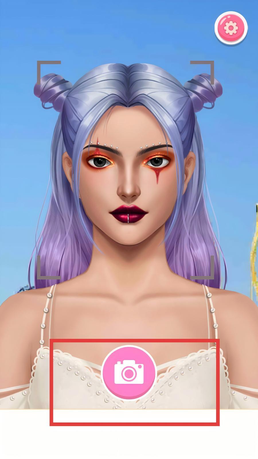 完成化妆绘制后,会进入角色整体造型展示界面。该界面会呈现已装扮好的角色,底部设有粉色相机按钮。点击这个相机按钮,就能触发拍照功能,对当前的角色造型进行虚拟拍摄。
