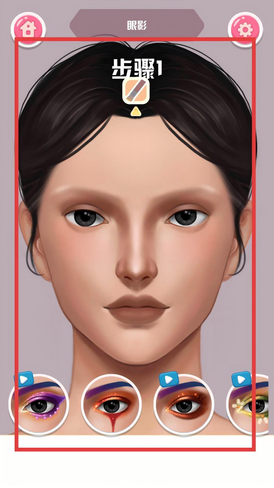 1、进入化妆步骤界面后,界面会呈现步骤1以及眼影工具,底部还展示着多种眼影样式的预览;从中挑选一款眼影样式,再按照指引为角色的眼部进行上色。