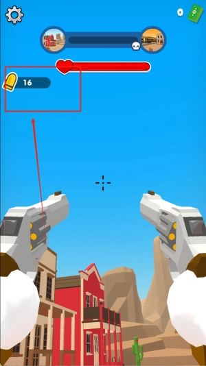 留意场景里戴着牛仔帽的敌人,瞄准靶心精准射击来赢得分数,同时要合理规划弹药的使用,防止出现没有子弹可用的窘境。