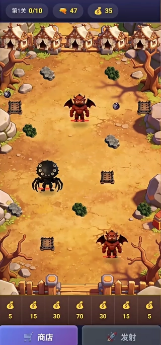 通过关卡获取金币,到商店里购买子弹来补充弹药,解锁新的魔兽炮弹以及弹射器的升级权限,不断提升战斗能力。