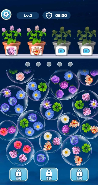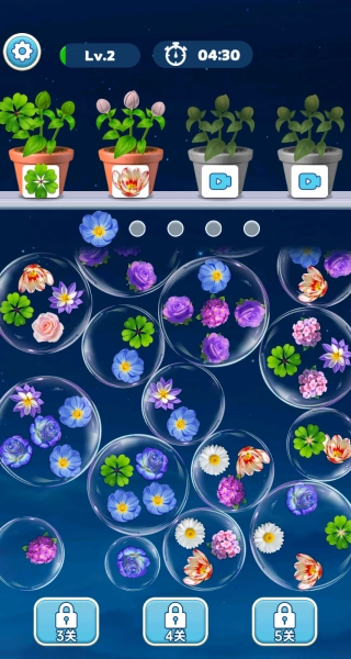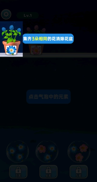 游戏的核心规则为“集齐3朵相同的花即可消除花盆”。当点击气泡内的花元素时,会优先挑选同种类的花朵,集中填充至对应的花盆中。