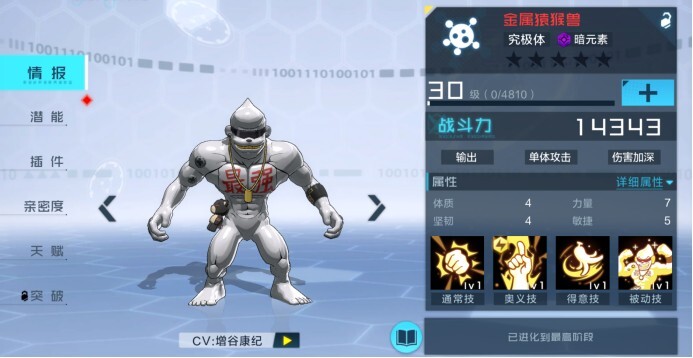 金属猿猴兽把输出系天赋点满,打起架来一拳就能撂倒一个对手。它的被动技能“全金属化”很实用,只要把状态叠满,就算不点生存和防御天赋,也能扛得住不少伤害。要是大家想让它更肉一点,也可以根据自己的偏好,额外点上防御强化和闪避强化这两个天赋。