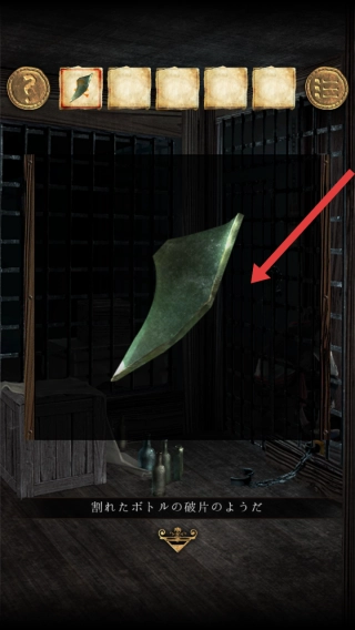 在牢房场景里收集物品时,会得到一个外形类似“割れたボトルの破片”(破碎瓶子碎片)的绿色道具,这个物品是解谜的关键所在,要注意相关的收集提示。