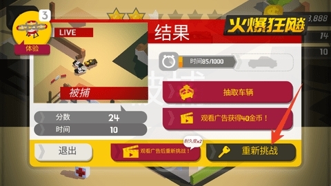 4、接着在结算页面的左侧会显示你被捕的视频,要是还想继续游玩,点击“重新开始”按钮即可。