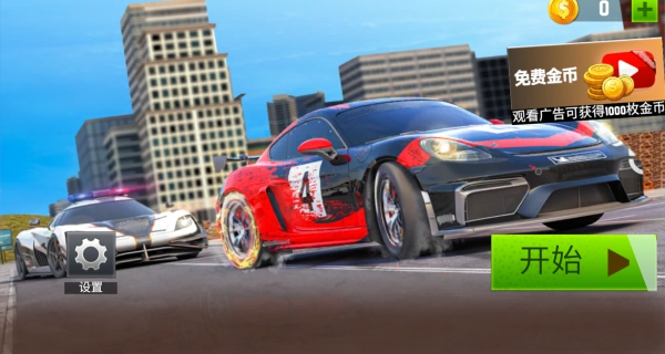 进入游戏后,点击界面上的开始按钮,就能看到酷炫的警车,还可以查看设置选项和免费金币的领取入口。