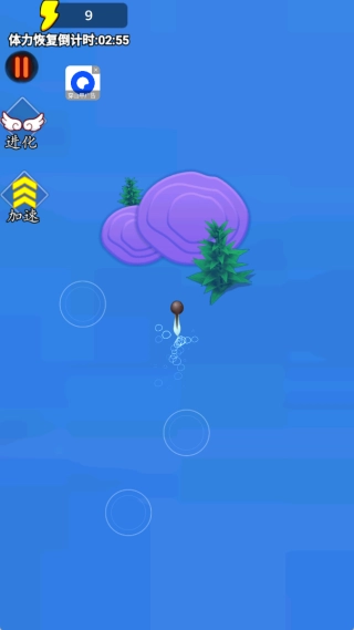 玩家滑动屏幕就能操控小蝌蚪的移动方向,当它靠近体型比自己小的生物时,吞噬动作会自动触发,完成吞噬后即可获取进化能量值。