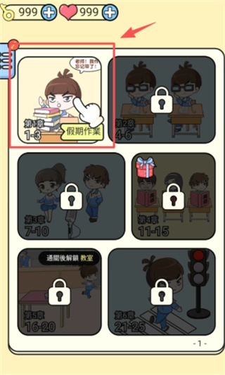 点击画面里红色方框中神情焦急的卡通女孩角色,根据右上角箭头的提示,开启第一章第三关的假期作业挑战。