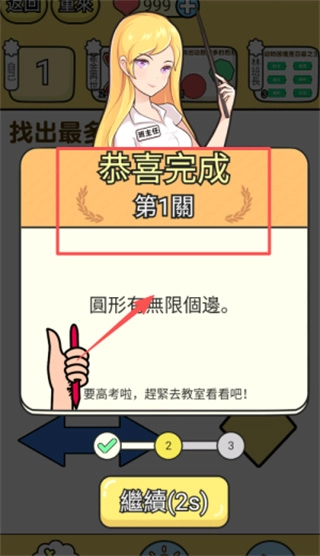 通过关卡后,你可以等待底部继续按钮的2秒倒计时自动结束,也能直接点击这个按钮,即刻进入下一关。