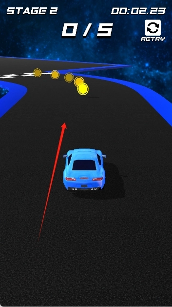面对环形悬空弯道时,要调整漂移的力度来避开红色障碍线,与此同时,还要收集赛道中段的金币群。