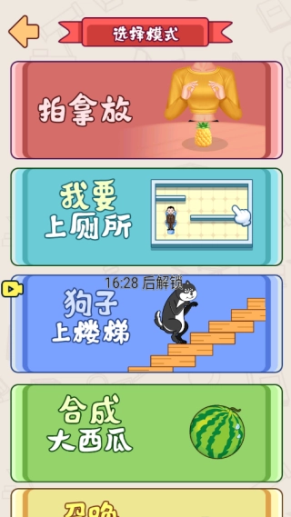 进入游戏后,首先需要选择模式,可选的模式有拍拿放、我要上厕所、狗子上楼梯等。