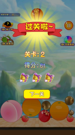 在合成操作的过程里,有机会得到新的道具,像水果刀这类,免费的道具能帮助玩家顺利通关。