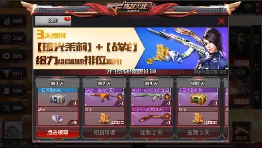 3. 强化社交互动与团队协作功能,玩家能创建战队,和好友携手战斗,一同角逐胜利。穿越火线枪战王者快速获取钻石的途径: 1、每日首次登录CFM后,可参与签到活动,坚持每日签到能积累相当数量的钻石。