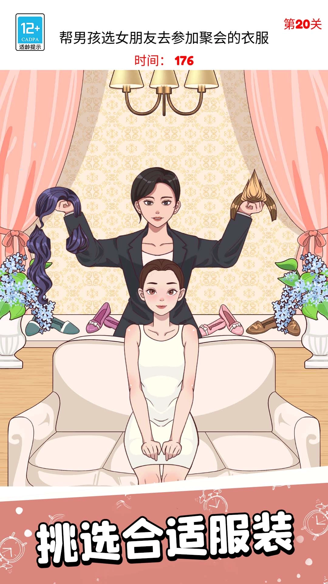 玩家在挑选聚会服装、帮助人物减肥等不同剧情场景里,依靠思考与选择推进并完成任务,体验别具一格的益智乐趣。