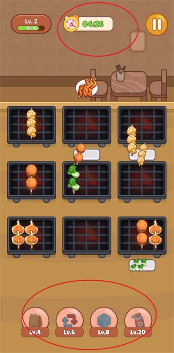 1、玩法十分简单,只需把不同的烤串移到空位上,只要凑够三个相同的烤串就能成功消除并完成上菜;