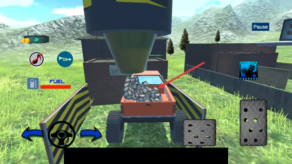 操控卡车(通过方向盘和踏板),在草地路面行驶,避开途中的障碍物,寻找由“箭头”指示的目标地点。