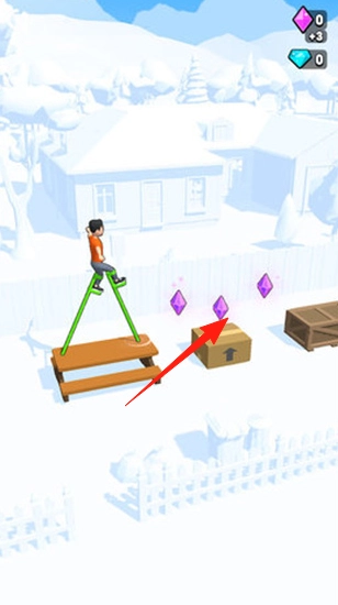 在雪地地图里踩着高跷移动,跃过木箱障碍,精准拾取紫色水晶,借助场景中的长椅来辅助行动,完成所有道具的收集,从而推动关卡进度。