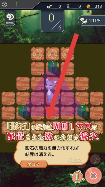 在关卡里,要理解“影石”的规则——其周围1格内的配置数量等于魔力减少量,然后移动紫色角色,调整影石的位置,以此来降低魔力。