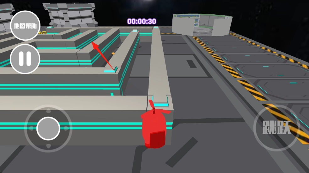 通过左侧带红箭头标识的摇杆来操控移动方向,当碰到障碍物时,点击同样标有红箭头的【跳跃】按钮,在迷宫通道中穿行,直至找到出口。