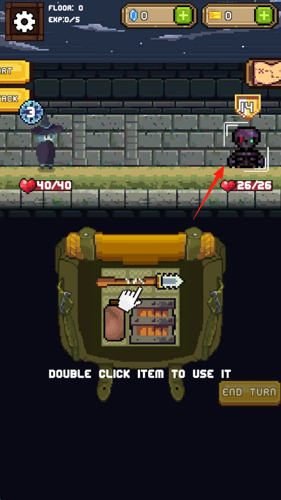 当遭遇敌人(红箭头标识)时,双击背包内的道具(如武器、药水),即可触发攻击与回复效果,逐步消耗敌人血量(从26/26降至0),成功通过当前楼层后,将积累对应经验值(当前进度为0/5)。