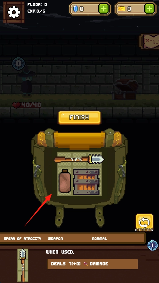 打开背包(红箭头所指位置),将“SpearofAtrocity”进行装配,随后点击【FINISH】按钮完成操作。完成装备后,武器即可生效,攻击能力得到提升(当前伤害为7+0),以便更好地备战怪物。