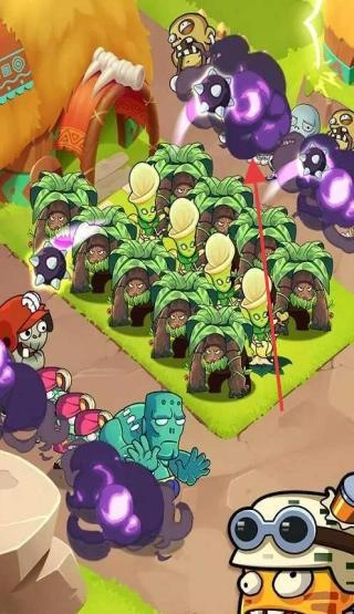 战斗时,遇到红箭头标识的紫色僵尸,要使用具备大面积伤害效果的群攻类植物来快速清理它们,以此保护好已布置的植物阵型,最终赢得胜利。