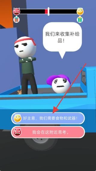 在对话界面中,选择【好主意,我们需要食物和武器!】这一选项,就能启动收集补给的流程,从而推动剧情发展。