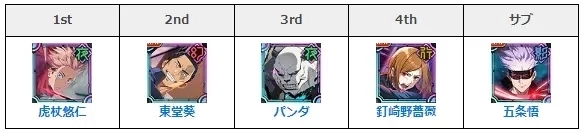 对单体输出火力的「虎杖悠仁(SSR)」「釘崎野薔薇(SSR)」为核心组成的对BOSS造成打击的编队。借助「東堂葵(SSR)」和「熊猫(SSR)」的好友羁绊,可以吸引敌人的攻击,一边反击攻击过来的BOSS,一边给予错乱状态。