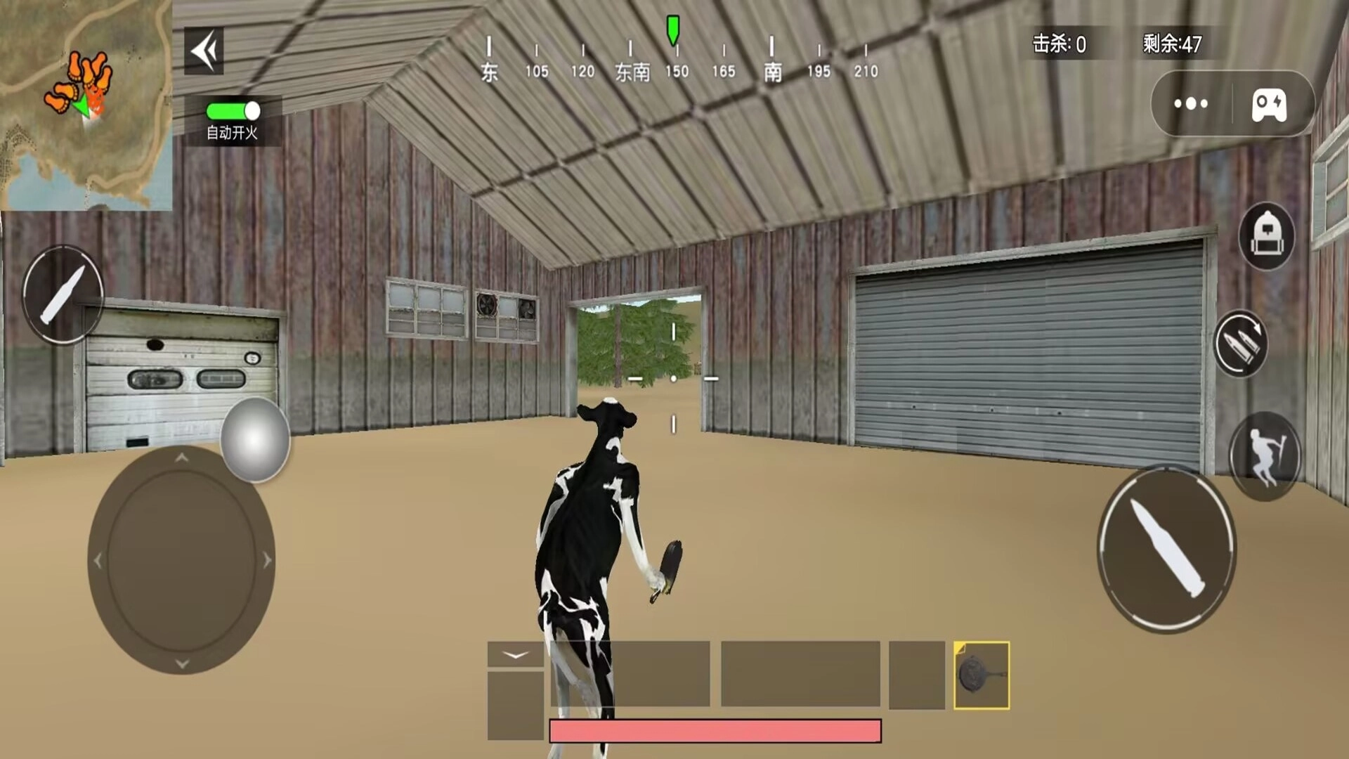 《精英吃鸡王者》是一款充满魔性趣味的动作射击游戏。游戏主角是一头能直立行走的奶牛,玩家将帮助它在战场上探索,收集各类道具,并消灭场景中的所有敌人。广阔的战场危机四伏,玩家需谨慎行动,巧妙利用建筑物隐蔽自身,灵活切换不同枪械武器击溃敌人,同时时刻留意自身血量,保持健康状态。祝你好运,成功夺冠!