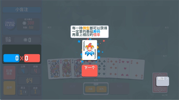 在小丑牌等离子模组安卓版中,游戏内拥有详细的游戏教程,你不用担心玩不懂游戏内容,每次你需要打出5张牌来赚取筹码分数,每种牌型将会提供不同的筹码分数,你可以在游戏中进行查看,你可以弃牌来跳过回合,但需要在有限的回合数中击败对手。