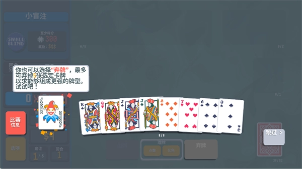 当你的牌特别烂时你也可以选择弃牌跳过该回合,最多可弃5张,但你需要在规定的回合数赢下对手
