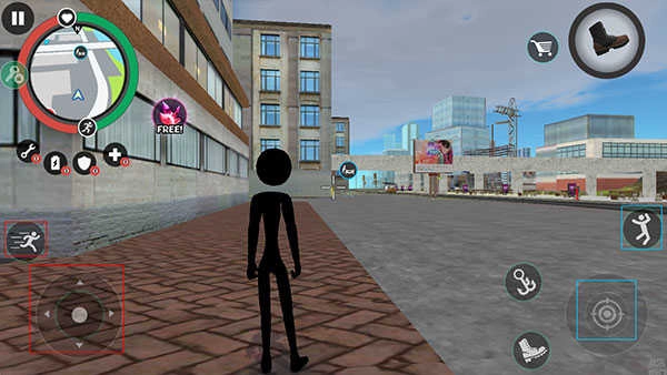 5、左侧的摇杆点击后可控制火柴人移动,右侧的钩子点击后能化身蜘蛛侠自由穿梭,点击“人”的图标可实现跳跃,点击瞄准镜图标则能发起攻击。