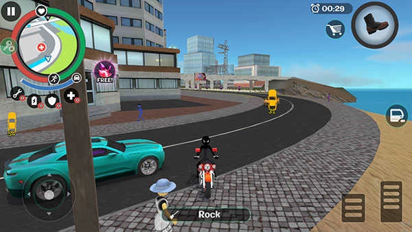 左侧控制移动与加速,右侧对应绳索和攻击(含跳跃功能),跳跃键独立设置;右上角的武器切换界面,以及血量、经验的数值都实时变动,信息清晰直观。玩家可自由选择玩法,与其他帮派成员展开枪战——击杀敌人能获取经验值,连续击杀会累积星级,届时警察与周边角色会重点针对你发起猛烈攻击。你的核心任务,便是在这样的局势中生存下来,并成功消灭对手。