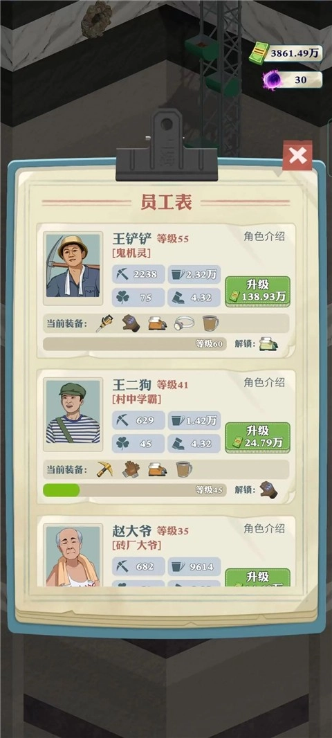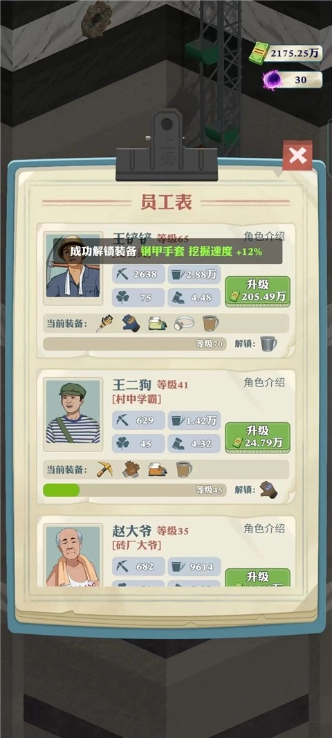 招募到员工后可以不断升级从而解锁新装备,提升各挖掘力~等级越高,所需要的金钱就越多,所以在金钱有限的前提下,比较推荐,先升级(消耗金钱比较少)的员工,能够更多的提升挖掘能力,性价比比较高的提升方式~