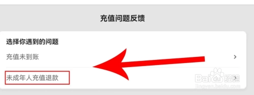 第二步,在充值问题反馈里点击“未成年人充值退款”选项并进入该页面。