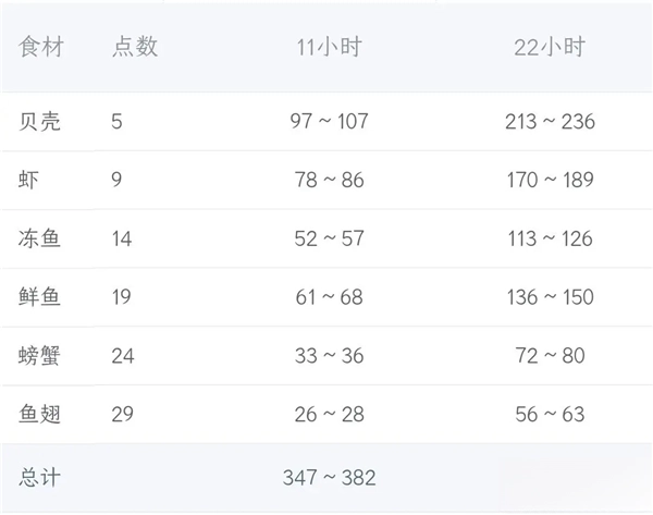 这意味着你制作一组鱼生的22分钟内,就已经用掉了半天采集到的食材;要是制作一小时,那一天采集的食材就都消耗完了。