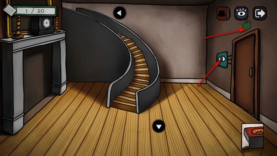 接着我们可以看到右侧有一间房间,上面有一个青苹果的图案以及一个可用于解谜的按键,于是我们便上楼去寻找和青苹果相关的线索。