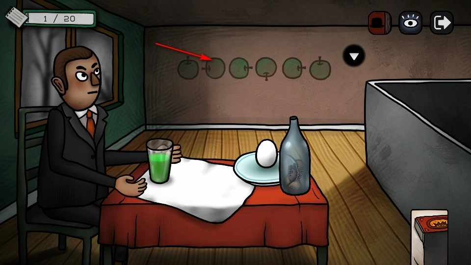 接着我们往楼上走,会遇到一个人,点击他的话他会和你互动并给出解谜的提示。不过我们的目标是找和青苹果相关的线索,所以后面墙壁上青苹果的朝向,说不定就是打开楼下那扇青苹果门的关键提示。