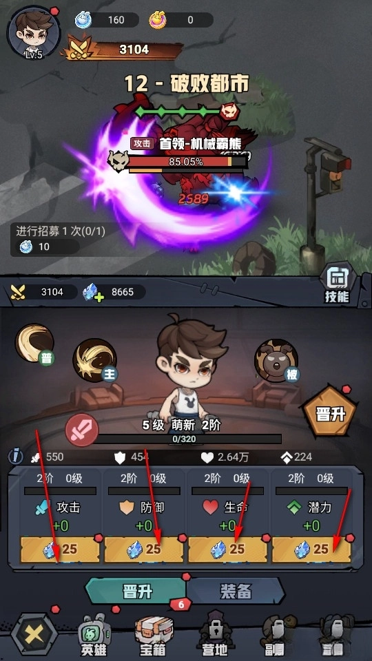 然后使用资源根据自己的喜好提升升级主角属性。