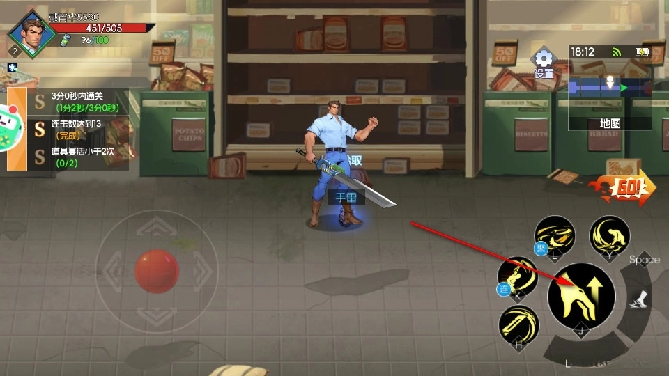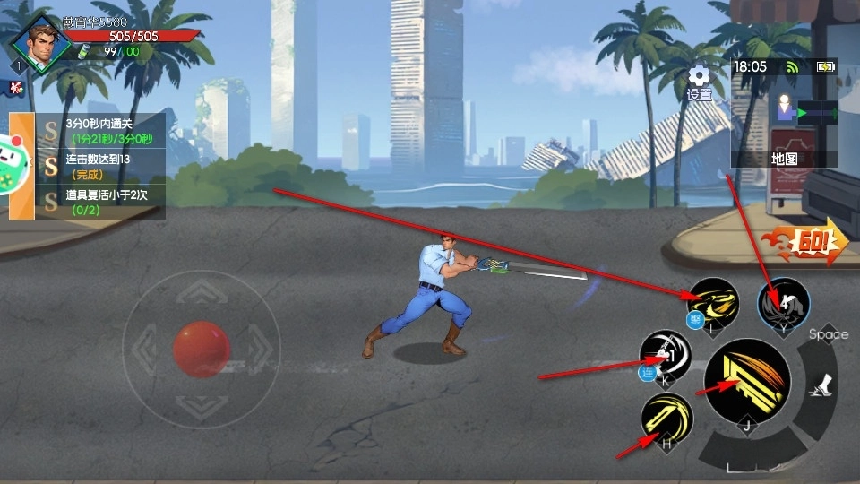 接着我们的右边是技能与普攻,一些技能拥有反击敌人强力攻击的作用,例如该人物的L技能(如图:普通攻击为J键,技能为H、K、L、Y键,普攻键右方和下方的按键分别为跳跃和冲刺。
