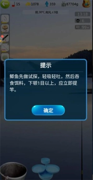 1、漂相不是浮漂一动就提竿(个别漂相比较直接没有假信号可以直接提),正口和假漂相不一样,很容易区分,正口基本都是猛地一顿(有的大鱼是缓缓黑漂)。猛地一顿就迅速提竿,缓缓下沉黑漂的慢一点提竿,跑鱼了左边按钮会有提示,看一下为什么跑鱼。