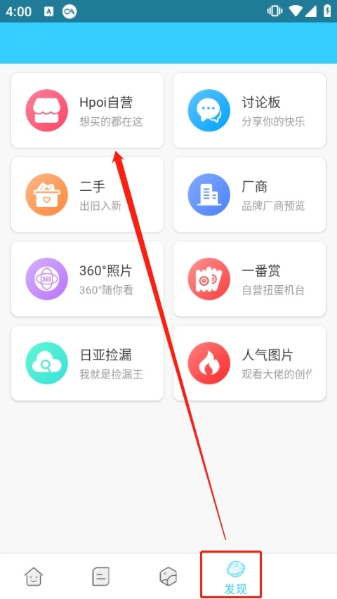 首先打开Hpoi应用,点击底部菜单栏进入发现板块,然后选择hpoi自营选项。
