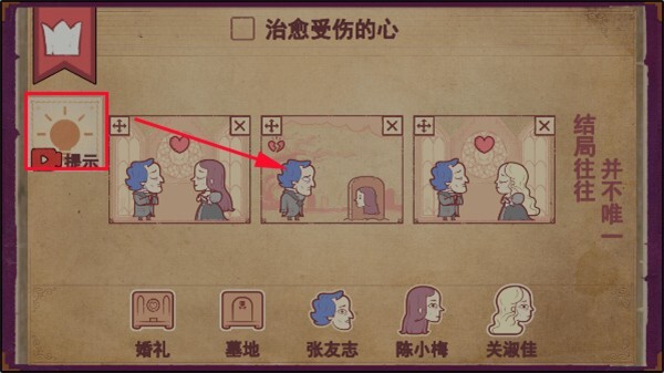 4、玩家先将婚礼放入第二个框框中,再将张友志和陈小梅放入第二个框框中,他们会心碎,如图所示。