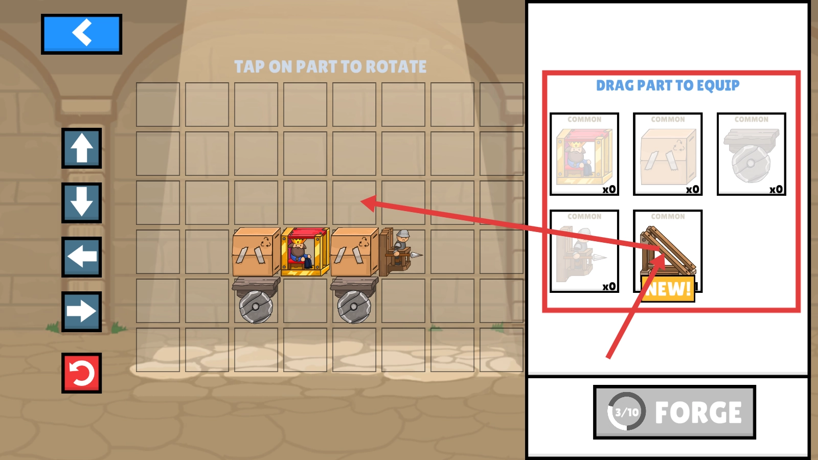 确认投石机各部件已安装到位,可点击旋转部件来调整布局,务必保证战车结构合理,以便为对战做好准备。