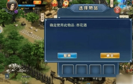 5、接下来点击【喝酒】选项,随后在弹出的【选择物品】对话框中选中【杏花酒】,阿星便会饮用这坛酒。需要让阿星总共喝下20坛杏花酒。